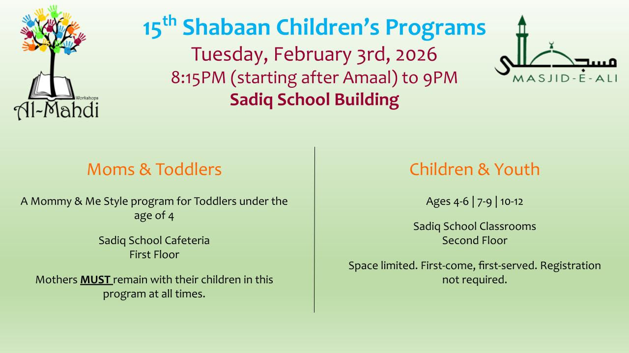 | Maghrib & Isha | Jamaat At Prime Time - 5:00PM - 6:00PM | Jamaat At Prime Time - 5:00PM - 6:00PM | Jamaat At Prime Time - 5:00PM - 6:00PM Dua-e-Tawassul 7:00pm | Jamaat At Prime Time - 5:00PM - 6:00PM Explanation of Islamic Laws | Jamaat At Prime Time - 5:00PM - 6:00PM Dua-e-Kumayl 7:00pm | Jamaat At Prime Time - 5:00PM - 6:00PM | Jamaat At Prime Time - 5:00PM - 6:00PM |