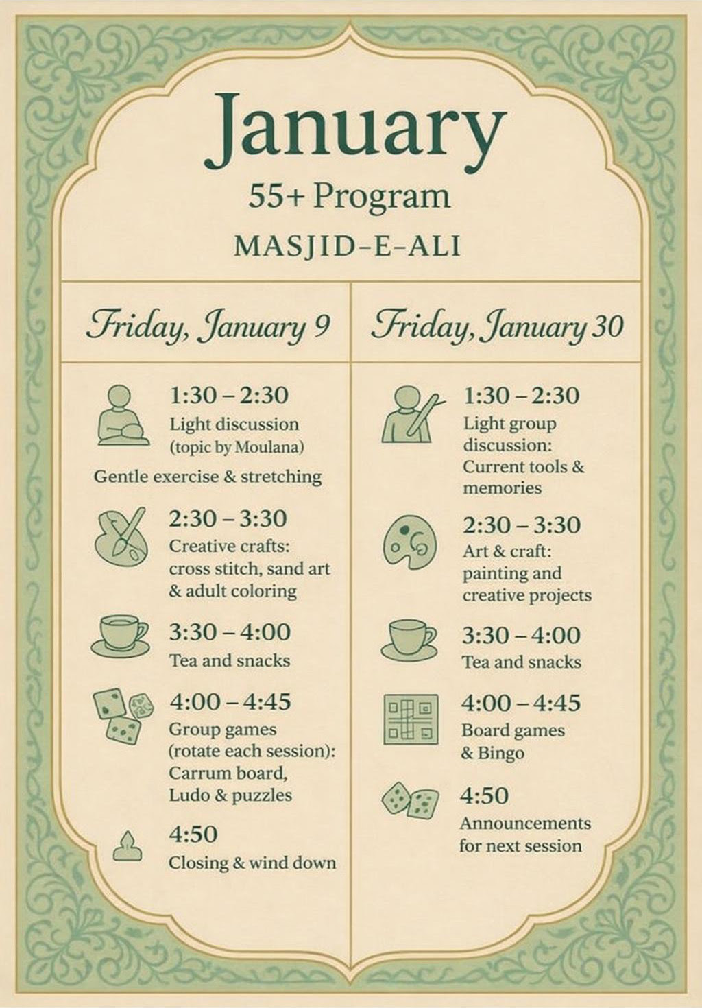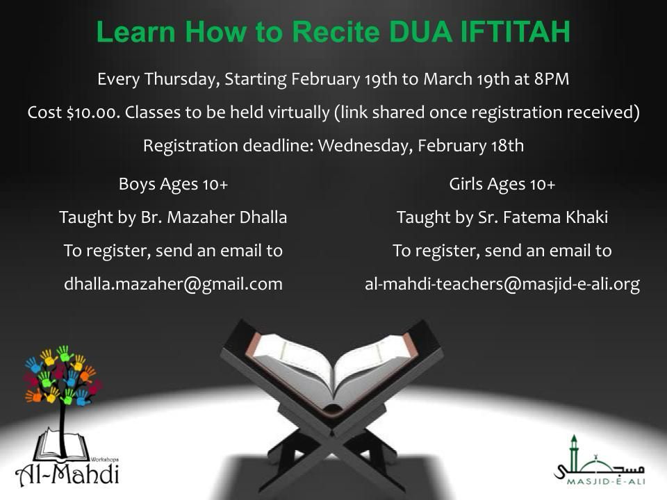 | Fajar | Jamaat 6:00AM Sharp - 6:00AM - 7:30AM Nahj ul Balagha & Ziyara-e-Ashura | Jamaat 6:00AM Sharp - 6:00AM - 7:30AM Quran Circle | |||||