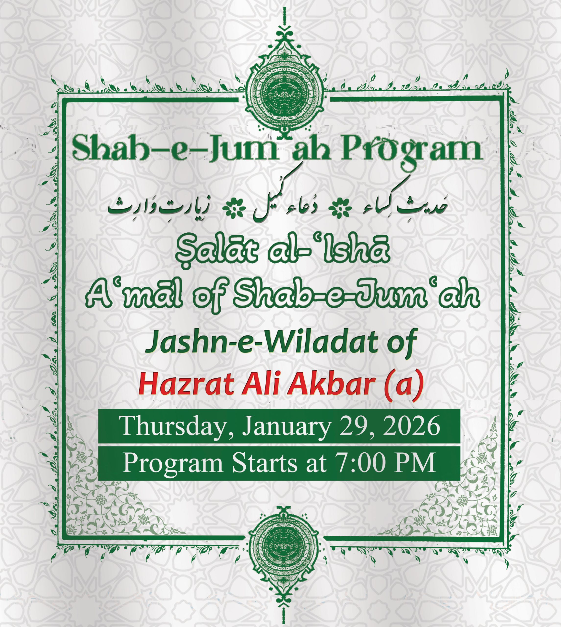 | Maghrib & Isha | Jamaat At Prime Time - 5:00PM - 6:00PM | Jamaat At Prime Time - 5:00PM - 6:00PM | Jamaat At Prime Time - 5:00PM - 6:00PM Dua-e-Tawassul 7:00pm | Jamaat At Prime Time - 5:00PM - 6:00PM Explanation of Islamic Laws | Jamaat At Prime Time - 5:00PM - 6:00PM Dua-e-Kumayl 7:00pm | Jamaat At Prime Time - 5:00PM - 6:00PM | Jamaat At Prime Time - 5:00PM - 6:00PM |